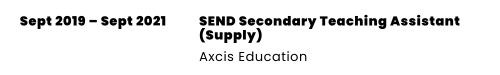5. Work History: Detail your work history in reverse chronological order starting with the most recent and work your way back. Include all relevant roles, even if they were in different sectors. For extensive supply work, summarise your experience and key achievements. For example: